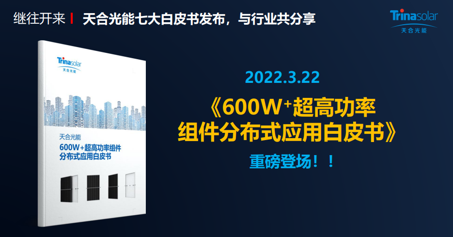 3月22日,天合光能重磅发布《600W+超高功率组件分布式应用白皮书》,系统解析用户关心的7大热点问题。白皮书客观正视600W+分布式发展过程中的挑战并给出全套解决方案,将进一步提升分布式光伏效率,建设完善的600W+分布式光伏生态,也将有力助推分布式光伏整县推进及全社会低碳化目标实现。