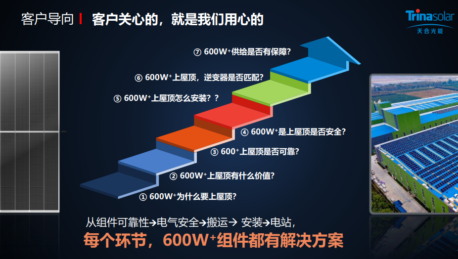 至今,600W+在户用和工商业市场的可靠性和系统价值已经获得市场的全面认可。天合光能始终以客户为中心,通过不断为客户提供最佳解决方案,提升客户价值。