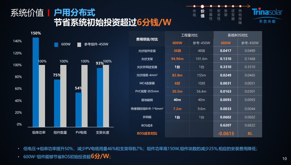 此外,经过全方位实证案例及第三方测试,600W+组件在分布式的应用价值十分显著。600W+组件在户用租赁模式下,典型常见屋顶可以节省系统初始投资超过6分钱/W,而且由于组件功率提升,安装块数减少,在新一代超高功率组件中系统价值全面胜出。