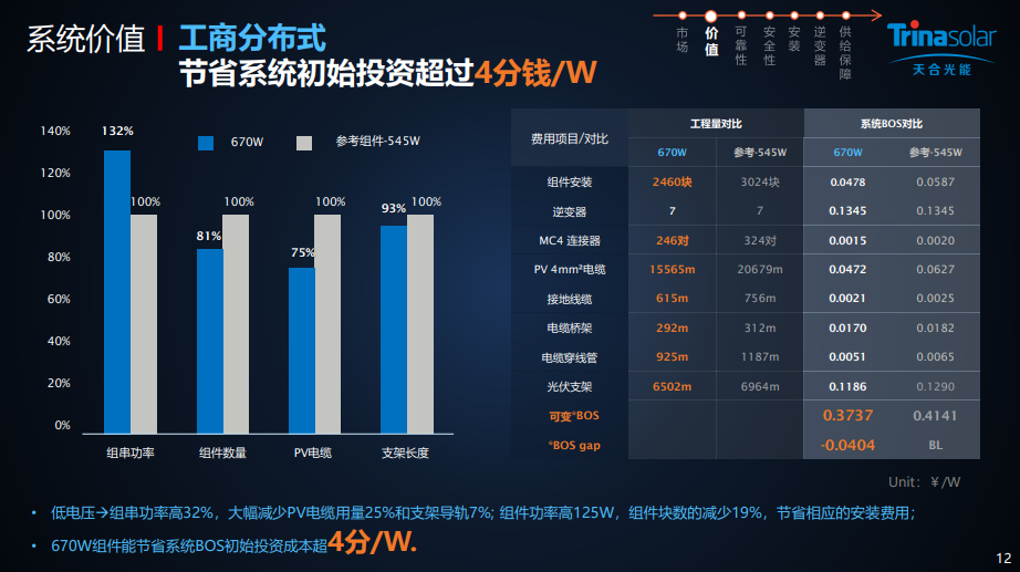 由于组件功率提升,安装块数减少,使得600W+在工商分布式场景下,至尊670W组件对比参考545W组件,节省系统初始投资成本超4分钱/W。670W组件组串功率更高,大幅减少PV电缆用量和支架导轨,组件块数的减少也相对节省了安装费用,这一成本节省甚至高达1毛钱/W。这将成为低碳化、能耗双控、绿电交易下,又一激发业主选择超高功率组件的关键原因。