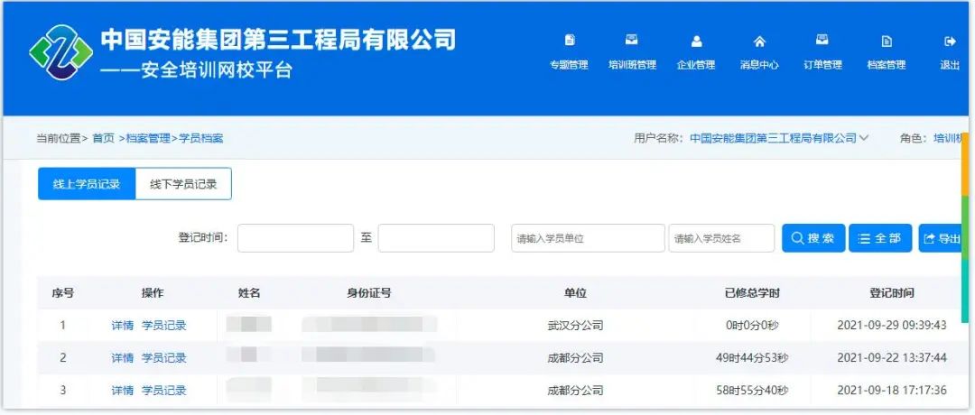 通过平台制定培训计划,组织培训实施与考核,并可查看所有员工的基本信息、培训时间、培训内容、考核记录,一人一档,规范安全培训过程及培训档案管理。学员在平台上达到学时要求后,管理员可以批量导出打印保存管理,学员也可以导出打印学时证明。