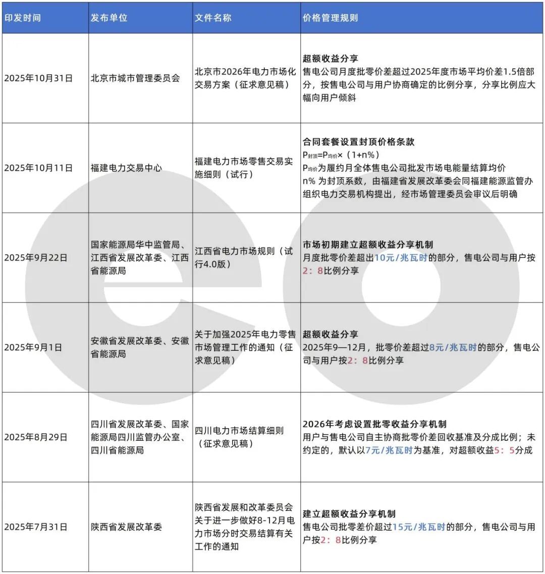 2025年7月以来,陕西、江西正式发文,四川、安徽、北京发布征求意见稿,提出实施超额收益分享机制。其中,北京于10月31日发布《北京市2026年电力市场化交易方案(征求意见稿)》提出,为抵御市场风险,促进批零价格传导,售电公司月度批零价差超过2025年度市场平均批零价差1.5倍的部分,按售电公司与用户协商确定的比例分享,且分享比例应大幅向用户倾斜。