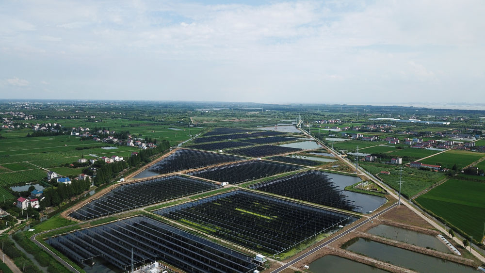 上海崇明绿华镇华星村千亩蟹塘的水面上覆盖着连片的太阳能光伏板(2023年7月25日摄,无人机照片)。新华社记者金立旺摄