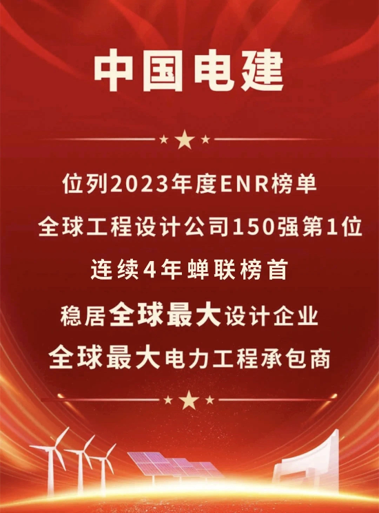 中国电建党委围绕国资央企“三个总”“两个途径”“三个作用”新使命新任务,聚焦主责主业,集成“投建营”全产业链一体化优势,主动服务国家重大战略,践行“国之大者”使命担当,企业综合实力持续获得提升。8月10日,2023年度美国《工程新闻记录》(ENR)“全球工程设计公司150强”和“国际工程设计公司225强”双榜发布,中国电建分别位列榜单第1位和第17位,连续4年蝉联“全球工程设计公司150强”榜首,连续9年在双榜单中位列中资企业第1位,保持了全球最大设计企业领先地位。8月24日,2023年度美国《工程新闻记录》(ENR)“全球承包商250强”和“国际承包商250强”双榜发布,中国电建分别位列榜单第6位和第8位,继续稳居全球最大电力工程承包商。作为全球清洁低碳能源、水资源与环境建设领域的引领者,全球基础设施互联互通的骨干力量,服务“一带一路”建设的龙头企业和全球工程设计企业的翘楚,中国电建具有政府信赖的国家能源战略服务能力和国际领先的高端技术服务能力,形成了能够代表国家综合竞争实力的水电、抽水蓄能、新能源等清洁可再生能源领域完备的技术服务体系、技术标准体系和科技创新体系。