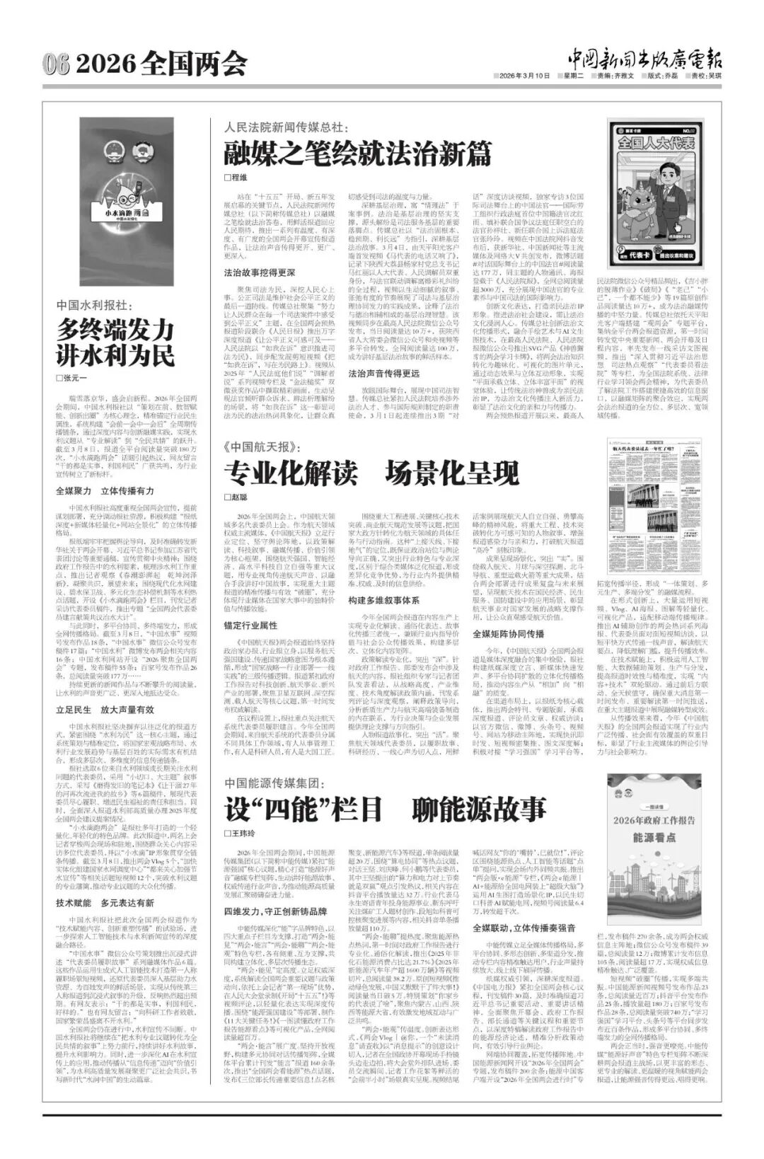 纸媒权威引领,深耕深度报道。《中国电力报》紧扣全国两会核心议程,刊发稿件30篇,及时准确报道习近平总书记重要活动、重要讲话精神,全面聚焦开幕会、政府工作报告、部长通道等关键议程和重要节点,以深度特稿解读政府工作报告中的能源经济论述,精准分析政策动向,有效引导行业舆论。