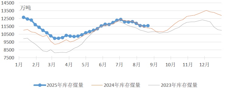 本周大范围持续高温天气有所缓解,燃煤电厂发电量及煤耗量环比基本持平。根据中电联电力行业燃料统计数据,本周(8月15日至8月21日,下同),纳入统计的燃煤发电企业日均发电量环比(8月8日至8月14日,下同)减少0.2%。日均耗煤量环比增长0.4%,同比减少4.9%。其中海路运输电厂日均发电量环比减少2.4%,同比增长1.7%;日均供热量环比增长1.1%,同比减少6.9%。电厂库存止跌回升,截至8月21日电厂存煤11603万吨,较8月14日增长40万吨;电厂库存可用天数20.8天,较8月14日持平。