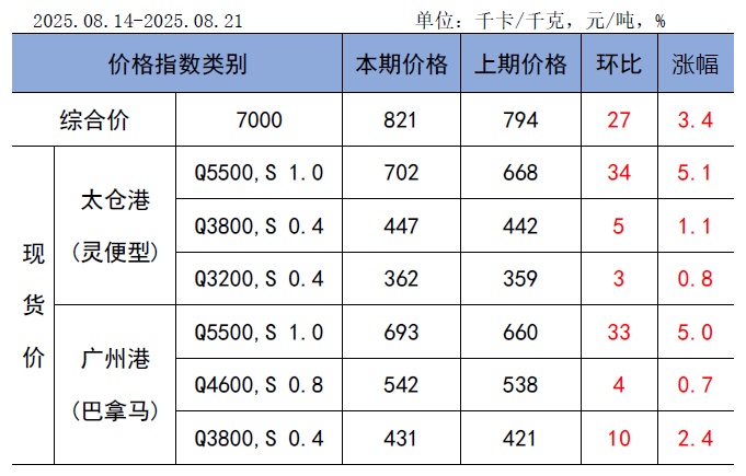 CECI曹妃甸指数5500千卡/千克、5000千卡/千克和4500千卡/千克平均价格分别为700.6元/吨、631.8元/吨和564元/吨,分别比上期平均价格上涨12.8元/吨、7.4元/吨和5.6元/吨。从样本情况看,本期曹妃甸指数日均现货交易数量较上期小幅增加,其中5500千卡/千克、4500千卡/千克数量略有增加,5000千卡/千克样本数量持平。