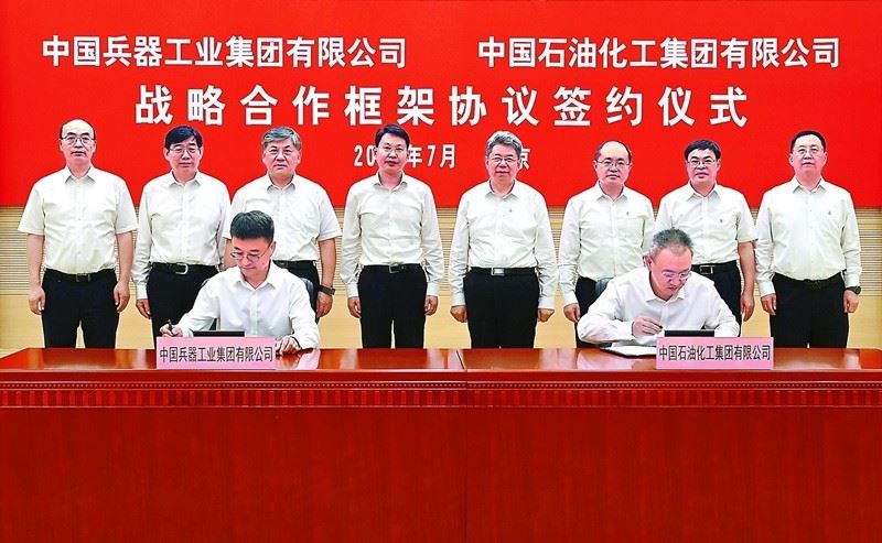 7月12日,中国石化与兵器工业集团在京签署战略合作框架协议。根据协议,双方将在工程建设、油气、新产品研发等领域全面深化合作。集团公司党组书记、董事长马永生与兵器工业集团党组书记、董事长程福波在总部会谈并一同见证签约。集团公司总经理、党组副书记赵东,兵器工业集团总经理、党组副书记刘大山参加。
