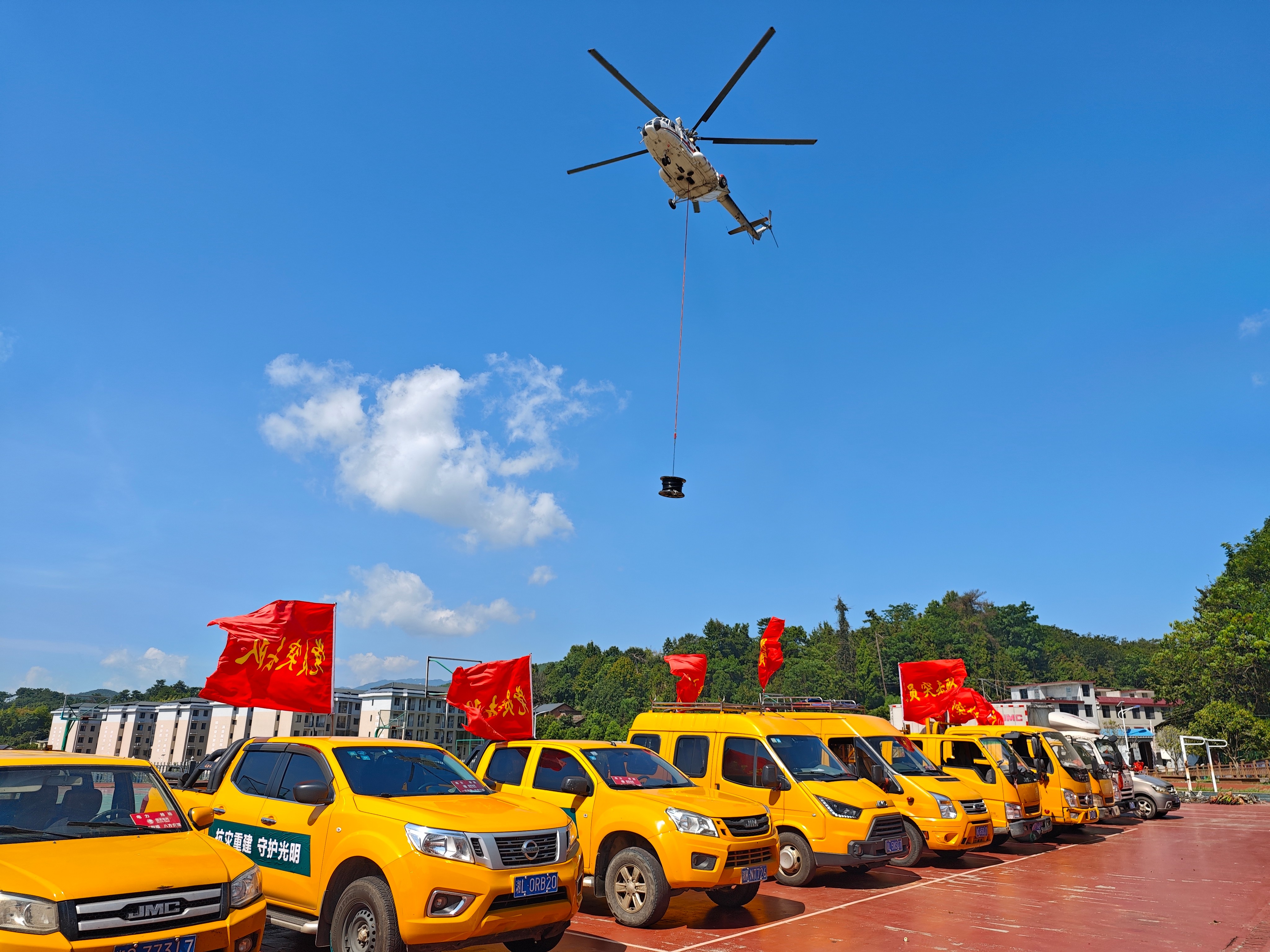 受台风”格美“影响,湖南省郴州资兴市发生严重洪涝灾害,为保障灾区村组供电,湖南公司采用直升机空投方式紧急配送发电机等物资。