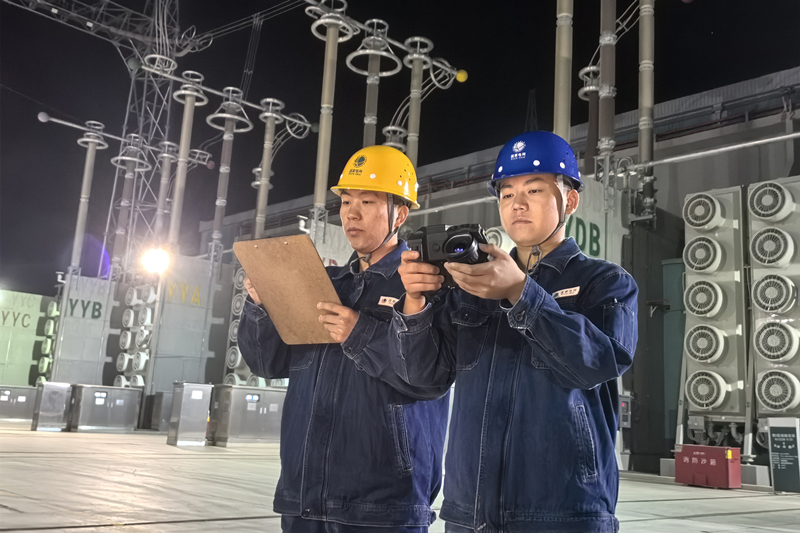 10月3日夜晚,在甘肃祁连±800千伏换流站,国网甘肃超高压公司运维人员用红外测温仪测量换流变电站本体、套管、引下线等部位温度,并对比分析设备温度变化情况,确保设备安全运行。