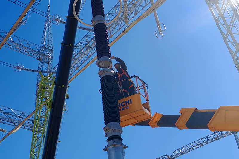 国网辽宁送变电工程有限公司员工在丰田220千伏开关站升压工程现场安装500千伏避雷器。
