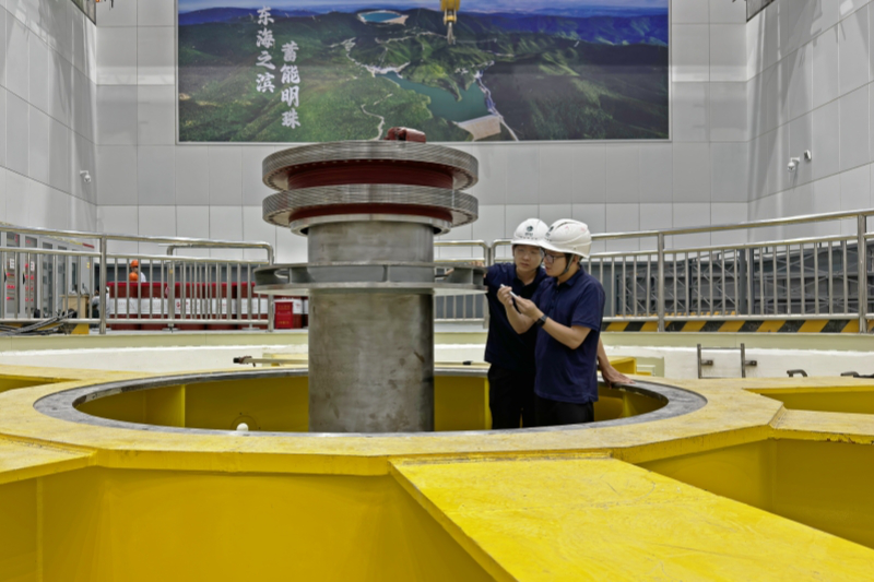 国网新源浙江宁海抽水蓄能有限公司员工检查机组组装情况。