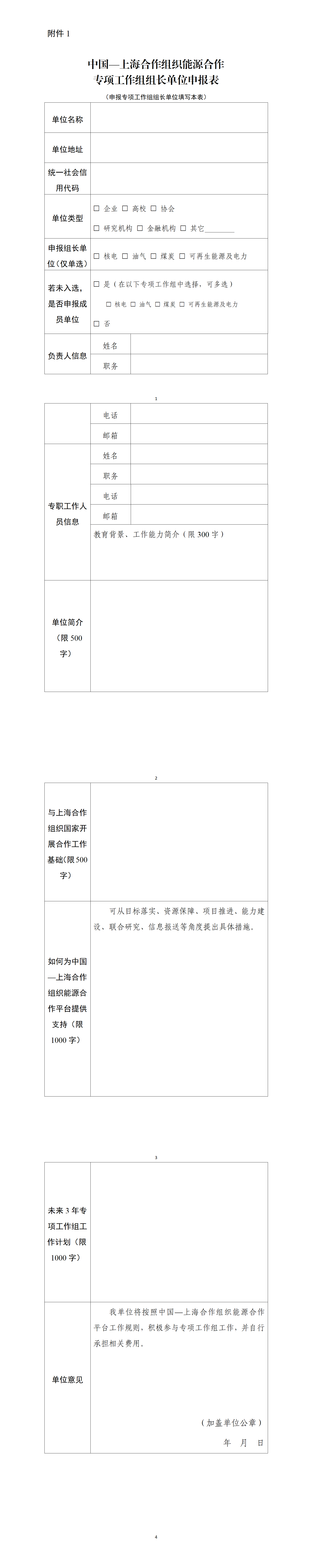 如申报组长、副组长单位,请填写《中国—上海合作组织能源合作专项工作组组长单位申报表》(附件1)。