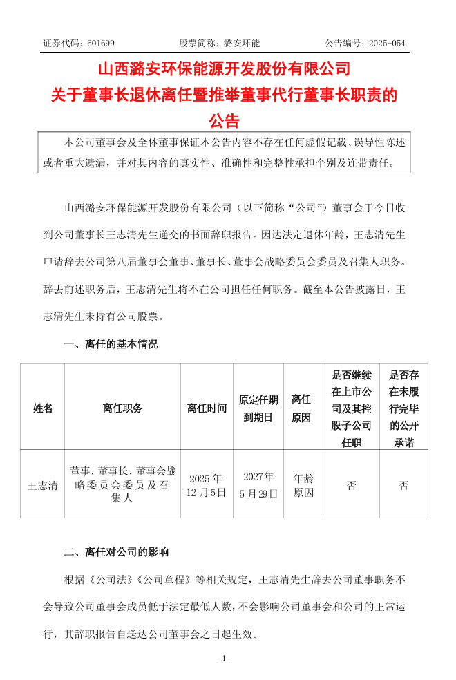 12月6日,潞安环能发布公告称,董事会于当日收到公司董事长王志清先生递交的书面辞职报告。因达法定退休年龄,王志清先生申请辞去公司第八届董事会董事、董事长、董事会战略委员会委员及召集人职务。辞去前述职务后,王志清先生将不在公司担任任何职务。