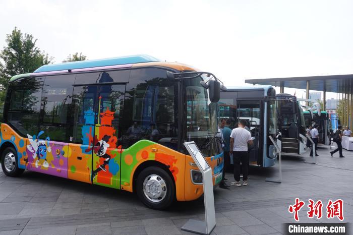 观众参观、体验各种型号的新能源公交车。韩章云摄