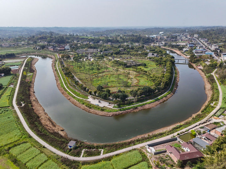 2025年4月2日,茫溪河流过四川省井研县千佛镇雷畅故居景区(无人机照片)。