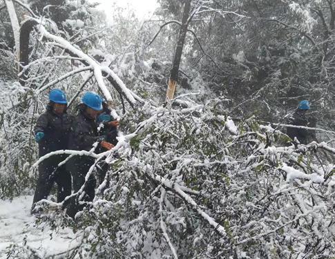 大雪封山,道路崎岖,车轮打滑无法前行,抢修队员只能徒步进山。抢修人员手脚并用,经过一路巡查,发现多处树木与积雪直接倾倒在电力线路上,甚至与线路完全缠绕在一起,造成多处断杆断线。高山气温寒冷,他们手脚已冻得不听使唤,但为了第一时间恢复电力供应,抢修队员咬紧牙关,继续进行抢修、树障清理工作。