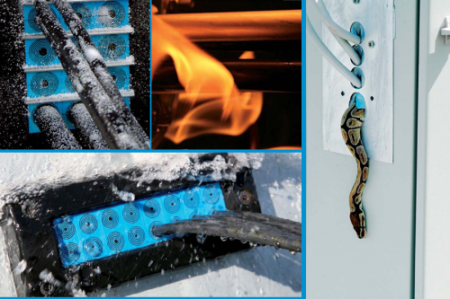 很多电力设施建设在户外人员较少的地区,周围小动物活动频繁,且建筑内部气温适宜,往往成为各类小动物的栖息地。啮齿动物对电力设备的影响,不仅会咬断、咬伤电缆,且极易造成二次接线短路,导致设备跳闸故障,影响正常供电秩序,严重情况下会对整个电网的运行造成威胁。在很多变电站,小动物最容易从结构的开孔处钻进室内,特别是电缆进出口处。在轨道交通沿线建筑物或户外机柜中躲避的蛇、鸟和小动物同样会造成事故风险。老鼠啃咬光纤和电缆会导致信号和通信设备故障,造成设备停机和车辆停运,甚至是致命的安全事故。