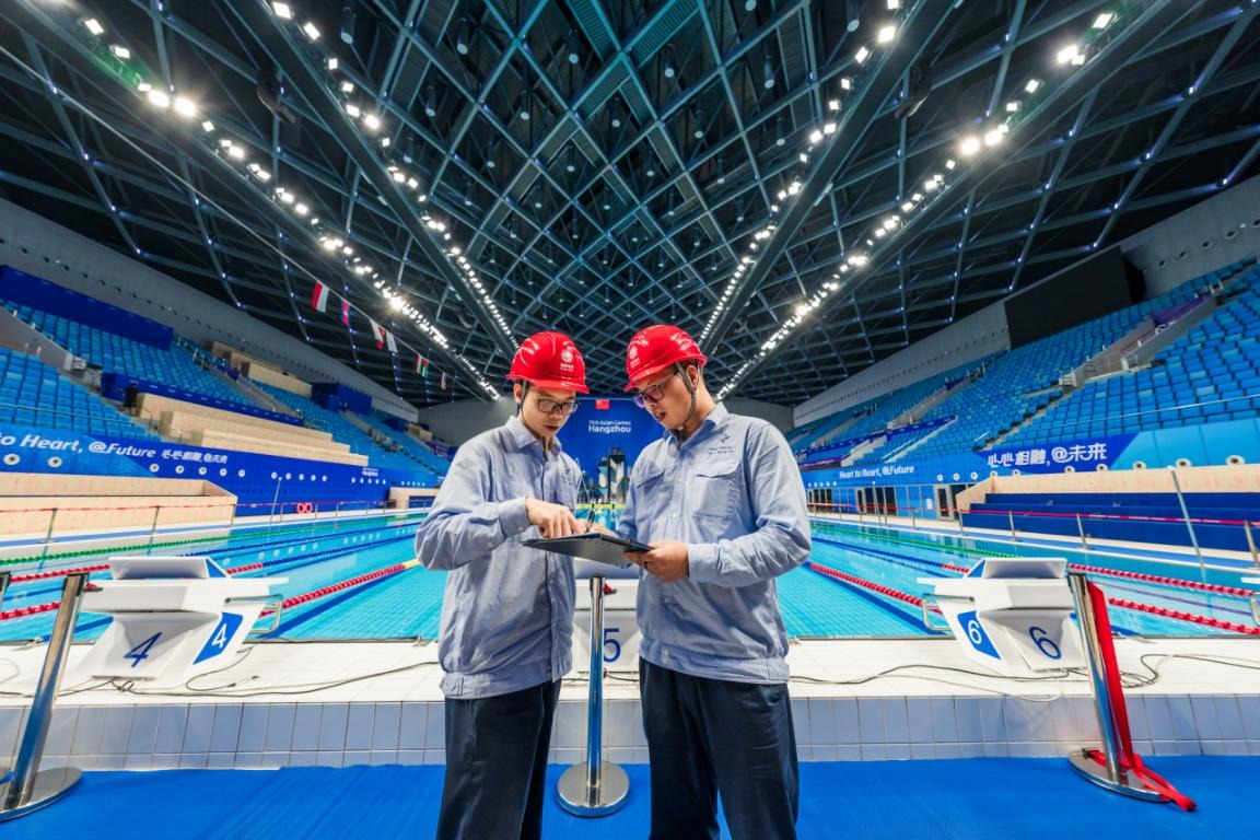 在杭州奥体中心游泳馆,国网浙江电力保障团队开展电力巡视,查治设备隐患,全力保障亚运保电万无一失。丁豪摄