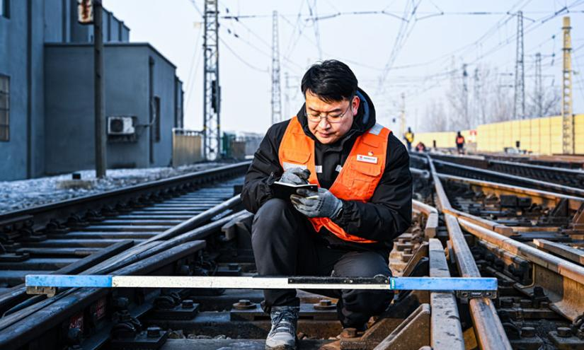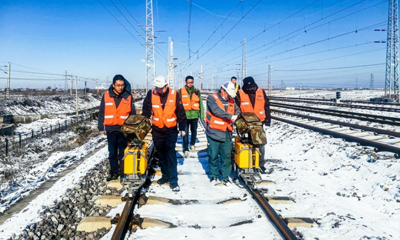 1月15日,朔黄铁路定州西站党员带头对线路几何尺寸进行检查,确保冬季线路质量安全平稳。秦素芳摄