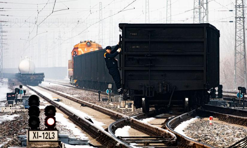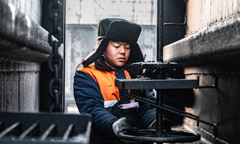 1月13日,朔黄铁路肃宁北车站员工对列车进行解除防溜作业。孟鑫摄