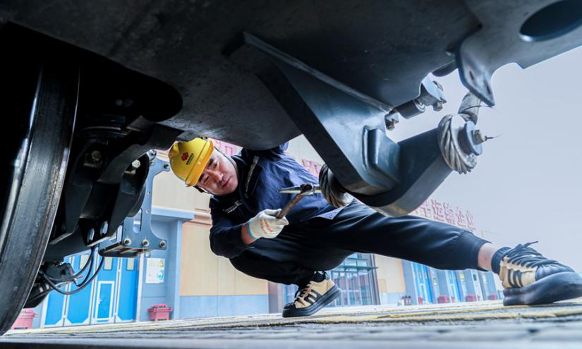 1月13日,朔黄铁路机辆公司机车检修中心员工正在进行修程机车转向架悬挂装置检查作业。于艳摄