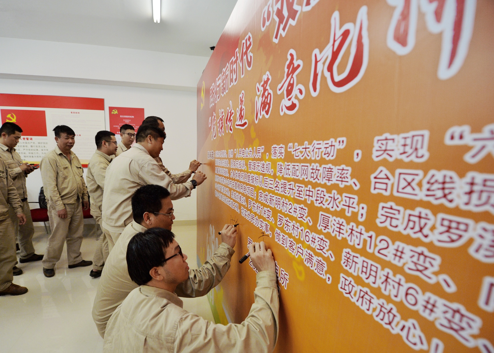 4月16日下午,在南安市最北部的罗东镇供电所,全体职工集体宣读承诺,并郑重地签下名字,这是他们作为南安供电公司“党旗传递 满意比拼”竞赛启动的首站供电所之一拿出来的比拼态度和决心。同一时间,在南安市最南部的石井镇供电所,全体职工同样庄重地作出他们的承诺,“我们将确保完成菊江村8#变老旧供电设备改造、110千伏老港变配套10千伏林边Ⅰ线工程建设,促成‘三安’节能减排光伏工程综合能源项目落地,切实为民办实事……”