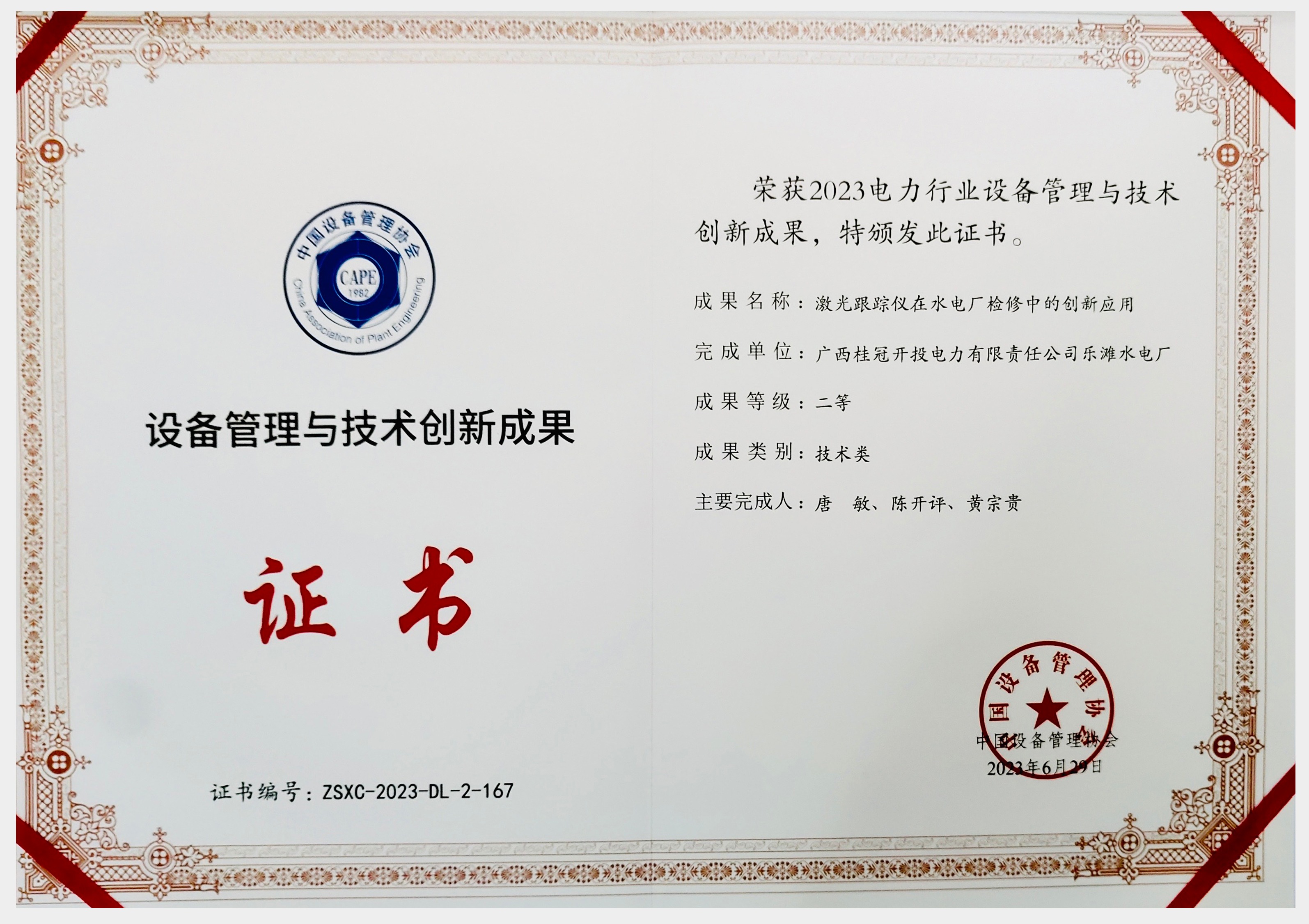 中国能源新闻网讯(寿文婷 潘承栋)近日,在中国设备管理协会2023年行业设备管理与技术创新成果交流大会上,由广西桂冠开投电力有限责任公司申报的《激光跟踪仪在水电厂检修中的创新应用》荣获“设备管理与技术创新成果二等奖”。