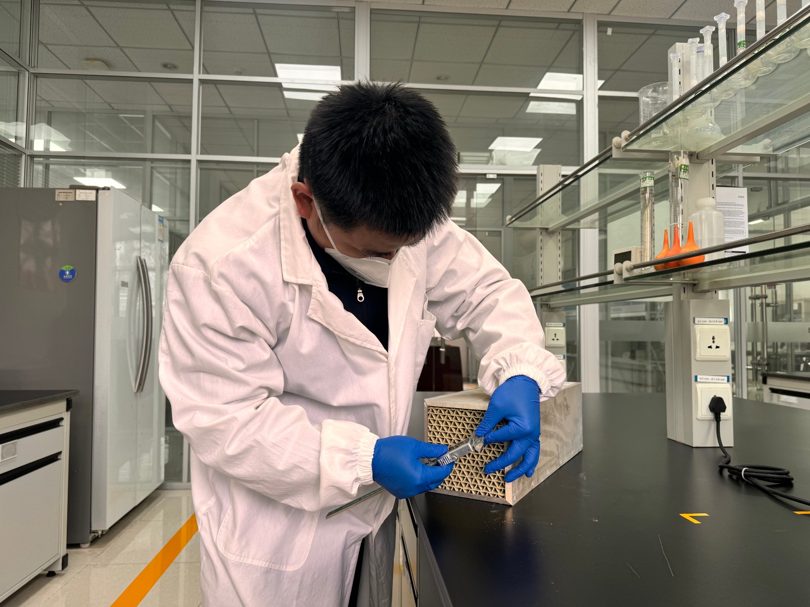 图为科研人员进行波纹板式脱硝催化剂测量。
