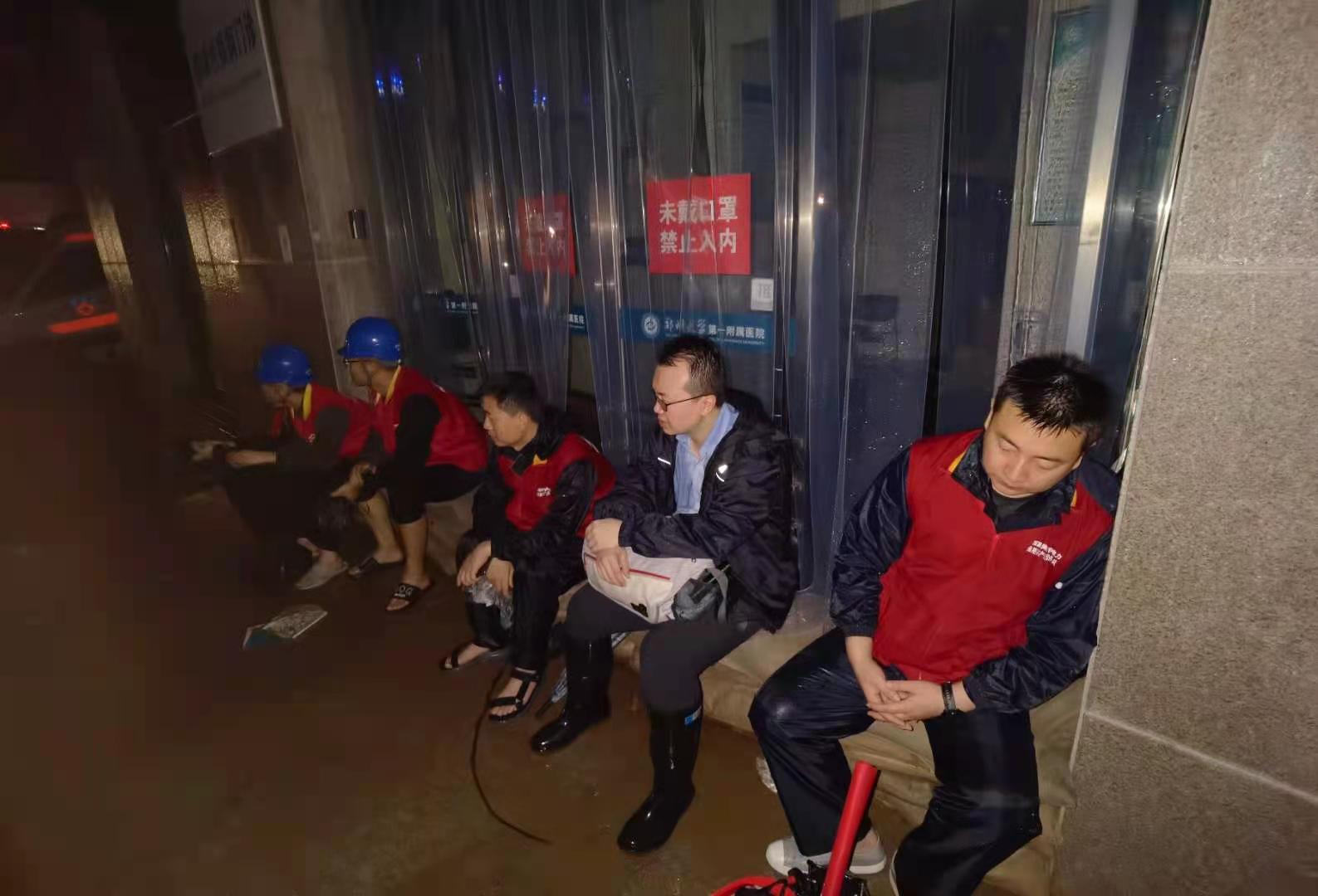 雨还在下,一路上被积水浸泡的汽车诉说着这场大雨的肆虐,被淹没的电动车在水下闪着灯光,被抛弃的汽车在路中凄厉地响着喇叭,这种似乎只在电影中见过的场景压让队伍的气氛十分沉重,经过半个多小时的艰难跋涉,先遣队员们终于来到了郑大一附院的急诊楼前,手电的光束照在平日里灯火辉煌的门诊大楼上显得格外微弱,后来我才知道,此刻的大楼里,还有上千名病人和家属急切地等待着救援,看着平日里灯火辉煌的医院大楼此刻陷入黑暗,队员们也暗暗着急。