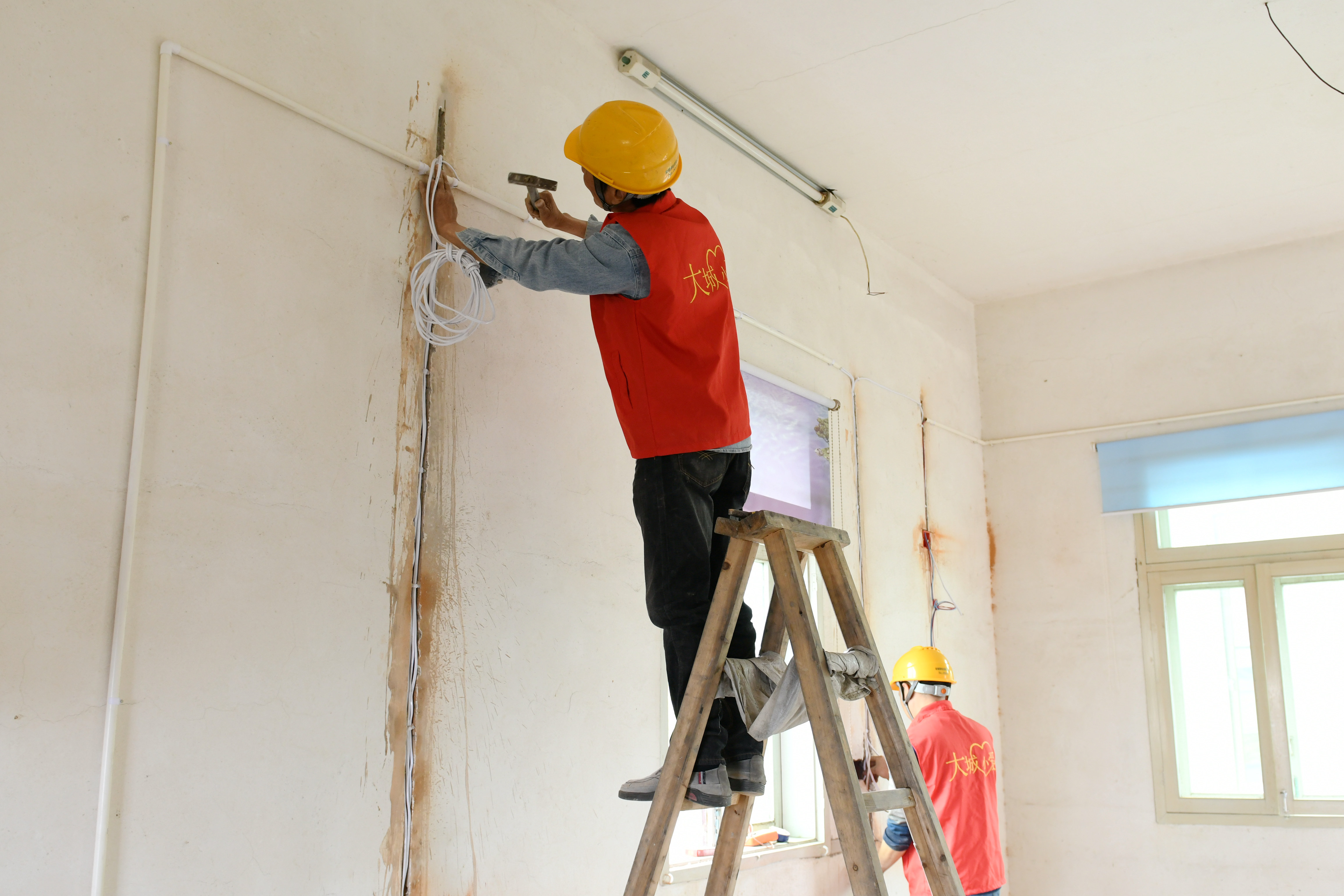 当天,根据前期方案,志愿者把露在墙上的旧线全部拆除,铺设新线、套进线管,并将其牢牢地固定在墙上,运用各种两通、三通接头使整个线路看起来横平竖直,美观大方。同时,每个出线口都装上插座和开关底座,便于墙面粉刷完毕后进行插座和开关安装。