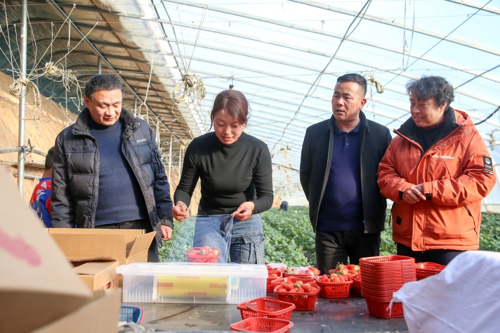 泾灵南村驻村工作队和村干部到周买儿家了解草莓销售情况。