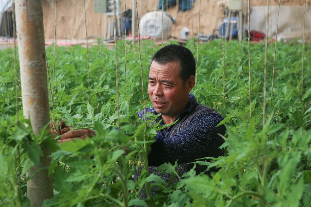 泾灵北村致富带头人马恩权在自家温棚整理作物。