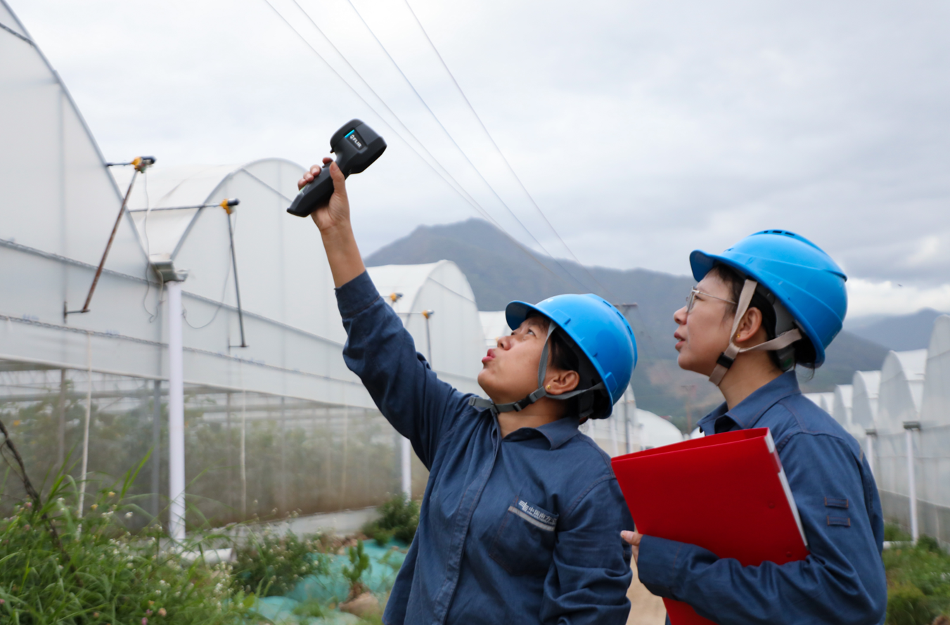 在黄瓜基地,南方电网云南玉溪元江供电局电力工作人员正在对大棚用电设备进行特巡特维,检查大棚内配电设备、漏电保护器、配电柜等,排查供电线路安全隐患,通过网格化经理制定“点对点”服务,讲解安全用电知识,询问客户用电需求,提升营商环境和电力服务水平。