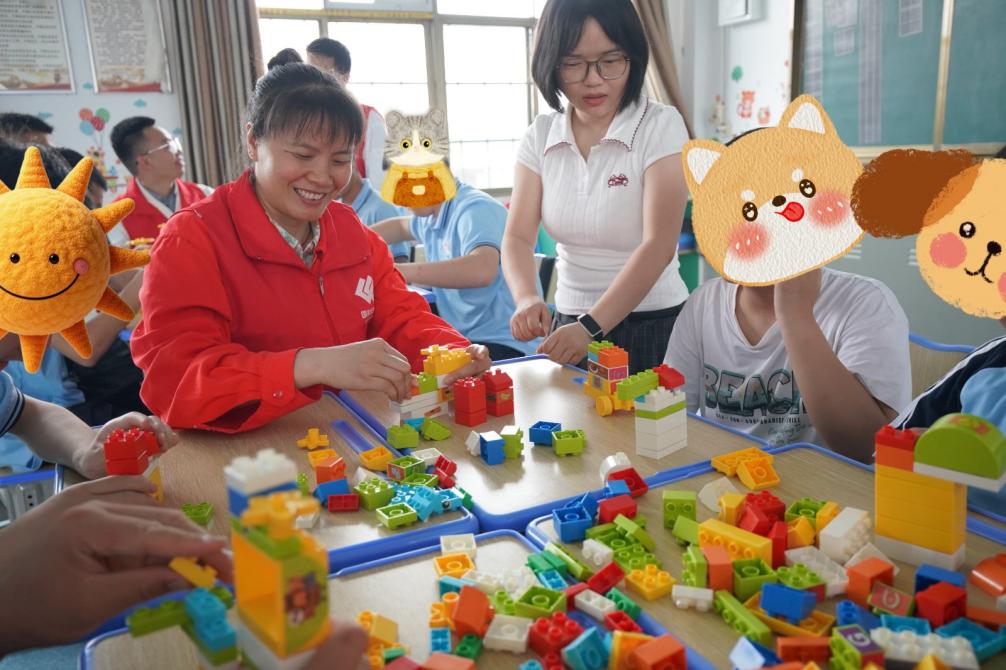 志愿者与孩子们共同搭建积木城堡。