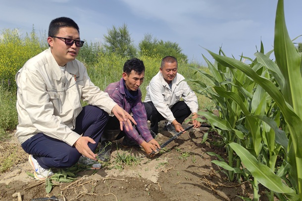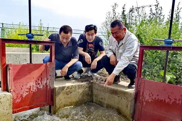 工作队队员查看滴灌情况。