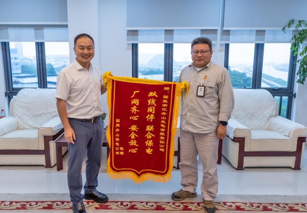 秀山舞海风,翠鸟鸣云间。6月11日,远望舟山群岛这早已熟于内心的美景,国家能源集团浙江公司舟山电厂的员工们又是一份别样的心情。喜悦和欣慰,自豪而振奋,每个员工的脸庞上都洋溢着灿烂的笑容。经历了二十个日夜里“孤岛”坚守,打赢了一场“只许胜不许败”的战役,让国能人的赤忱和担当闪耀于千岛之乡。就在这一天,国网舟山供电公司专程来到舟山电厂,将一面闪烁着“双线同停 联合保电,厂网齐心 安全放心”十六个鎏金大字的锦旗赠予该厂,对舟山电厂在5月19日至6月7日之间“孤岛”保电的壮举表达钦佩和感谢。这感人的场景,不禁唤起了员工们的回忆,那一幕幕感人肺腑的场景又在脑海中徘徊。