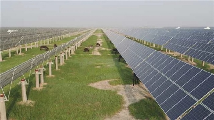 而在绵延如海的蔚蓝色光伏板下方,不再是裸露的盐碱地,而是精心铺设适合盐碱地种植的牧草。这些牧草不仅改善了土壤的结构、减少水分蒸发、降低了土壤盐碱度,还成为西门塔尔牛的饲料。