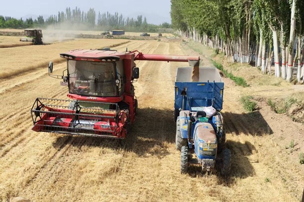 艾克拜尔紧锁的眉头舒展开了,他拍了拍身边隆隆作响的收割机,声音洪亮:“听见没!这是咱家麦子的‘救命符’!工作队本事大,说调车就真调来了,要不然,这麦子不知要在地里熬多久呢!”金黄的麦粒欢快地流进粮仓,也流进了村民们踏实的心坎里。