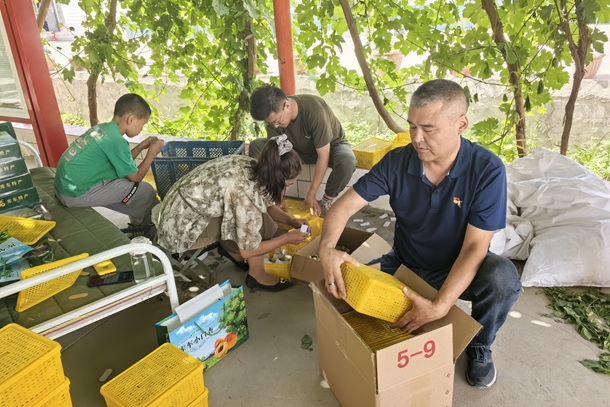 摘杏的队伍同样热火朝天。走进果实累累的杏园,浓密的枝叶下,阳光只能洒下斑驳的光点。工作队队员与村民正在按照白杏成熟度、新鲜度、完美度、整齐度,一个一个挑选,并为选出来的鲜杏一个一个穿上“外套”,再像对待珍宝似的整齐码放进果箱里。