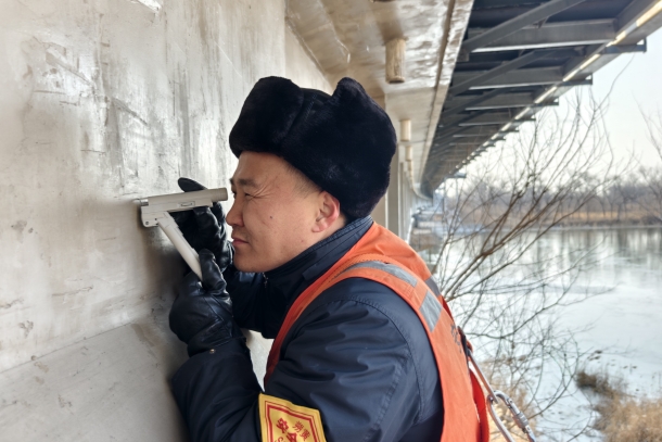刘海霖和侯桂兴分头检查,他们逐一复核螺栓,扳手一扣一松,确认紧固状态。对伸缩装置边缘结冰的部位,他们先清理再检查。看到混凝土表面有疑似裂缝处,他们就用刻度放大镜贴上去一点点比对,把宽度、走向、变化趋势都要记录清楚。