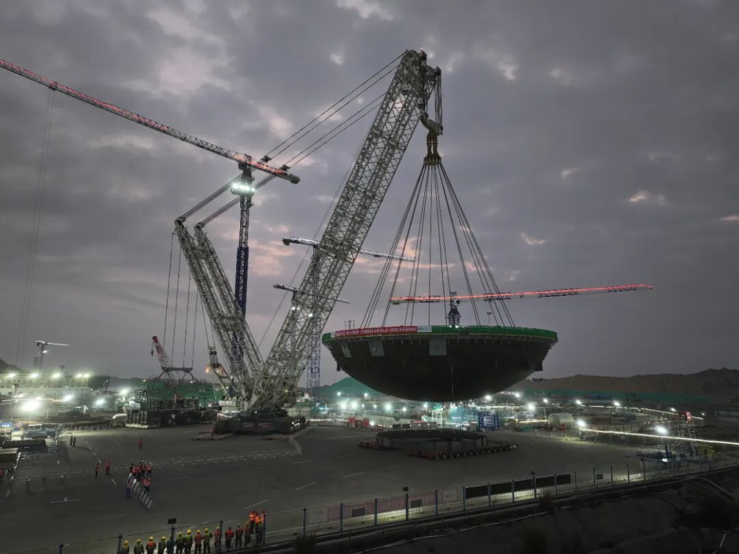 钢制安全壳是核岛的安全屏障,整个钢制安全壳由底封头、4个环段以及顶封头共6个部分拼装而成。与“华龙一号”机组不同,钢制底封头为CAP1000机型特有设计,本次吊装的CV底封头呈半球状,高11.4米,最大内径39.6米,吊装总重量约843吨。