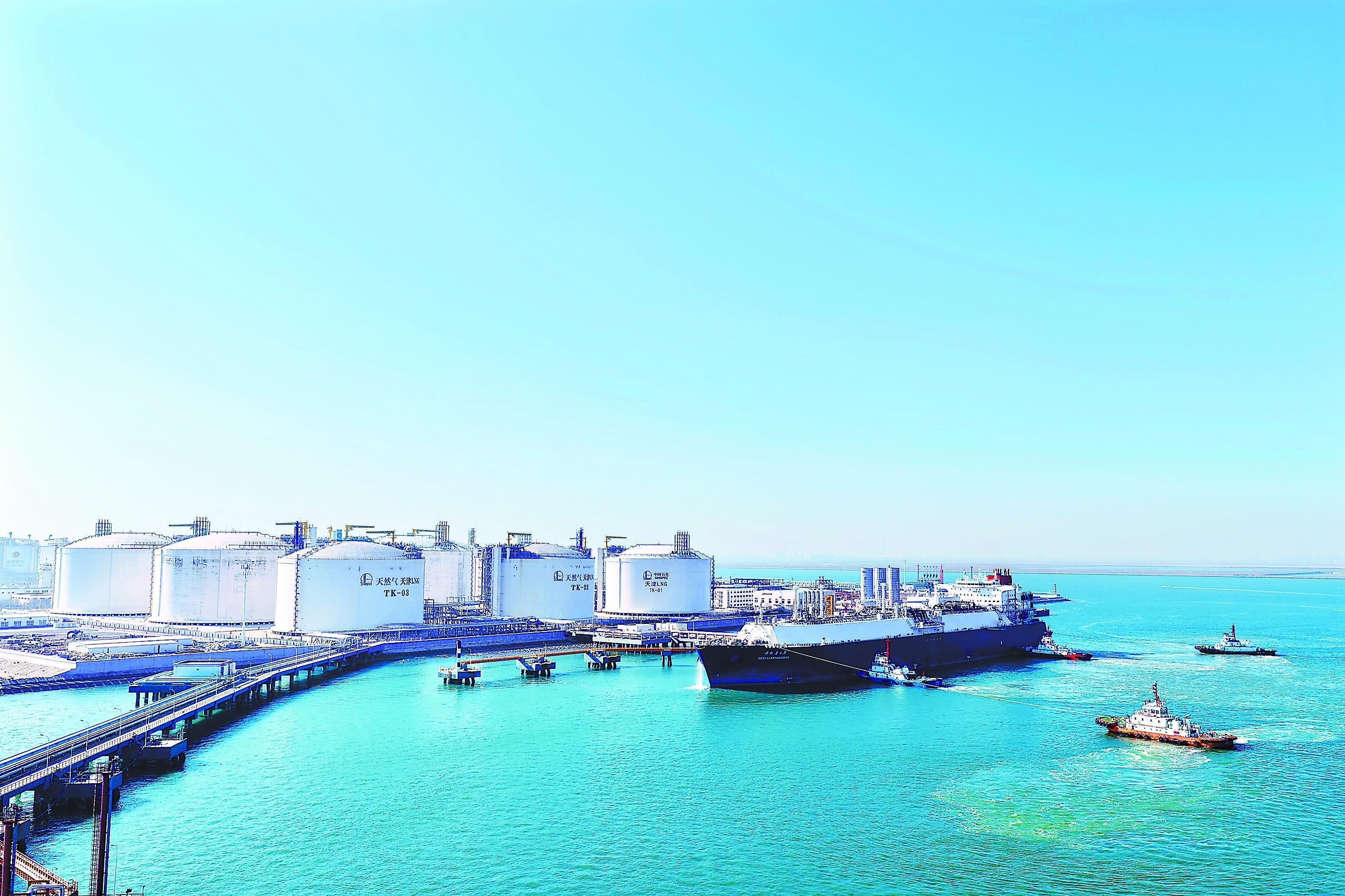 天然气分公司天津LNG接收站扎实做好冬季天然气保供,11月以来外输天然气超3.2亿立方米,可满足2000万户家庭用气需求。图为12月2日“中能天津”号LNG运输船靠泊天津LNG接收站码头。(王 军 摄 王卓然 文)