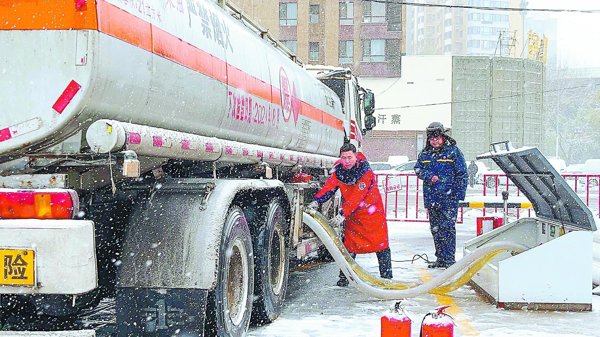 辽宁石油及时优化油品调度与配送,更换冬季低凝点油品,部分站点延长营业时间,全力保障冬季加油需求。同时,强化接卸油管理,从源头把控油品数质量。图为1月10日辽宁沈阳石油长青南街加能站员工在风雪中接卸油品。吴迪摄王晶文