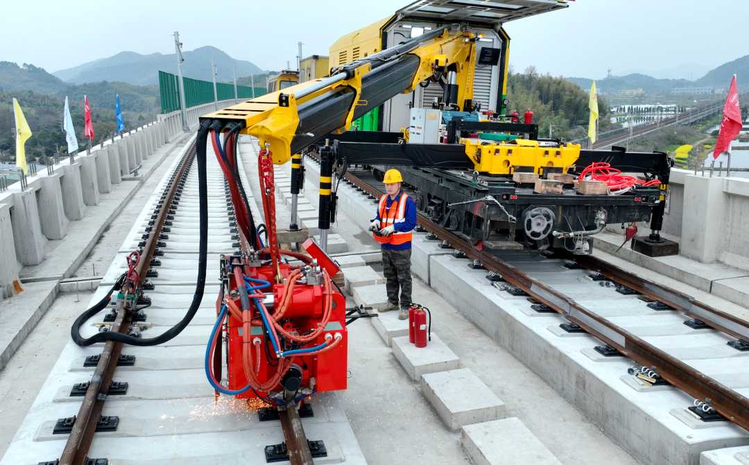 3月22日,位于浙江省湖州市德清县下渚湖街道的杭德市域铁路工程建设现场,中铁十一局工人操作国内首台新能源多场景闪光焊轨机进行钢轨焊接作业。