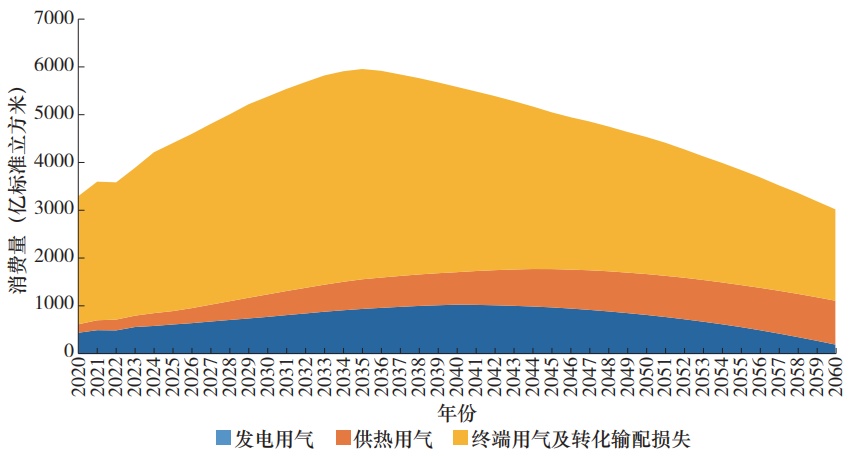 在能源系统转型过程中,天然气在电力(含供热)、化工、交通、居民生活等领域有较大增长空间,预计到2030年达5400亿立方米左右,2035年前后进入5900亿~6000亿立方米的峰值平台期,占一次能源消费总量的百分比较2024年提升1.6个百分点至10.5%以上。2035年后,随着非化石能源规模化发展,天然气的过渡性支撑能源角色将不断减弱,其消费量逐步下降,到2050年、2060年分别降至4500亿、3000亿立方米左右,2060年在一次能源消费中占比约6.5%。