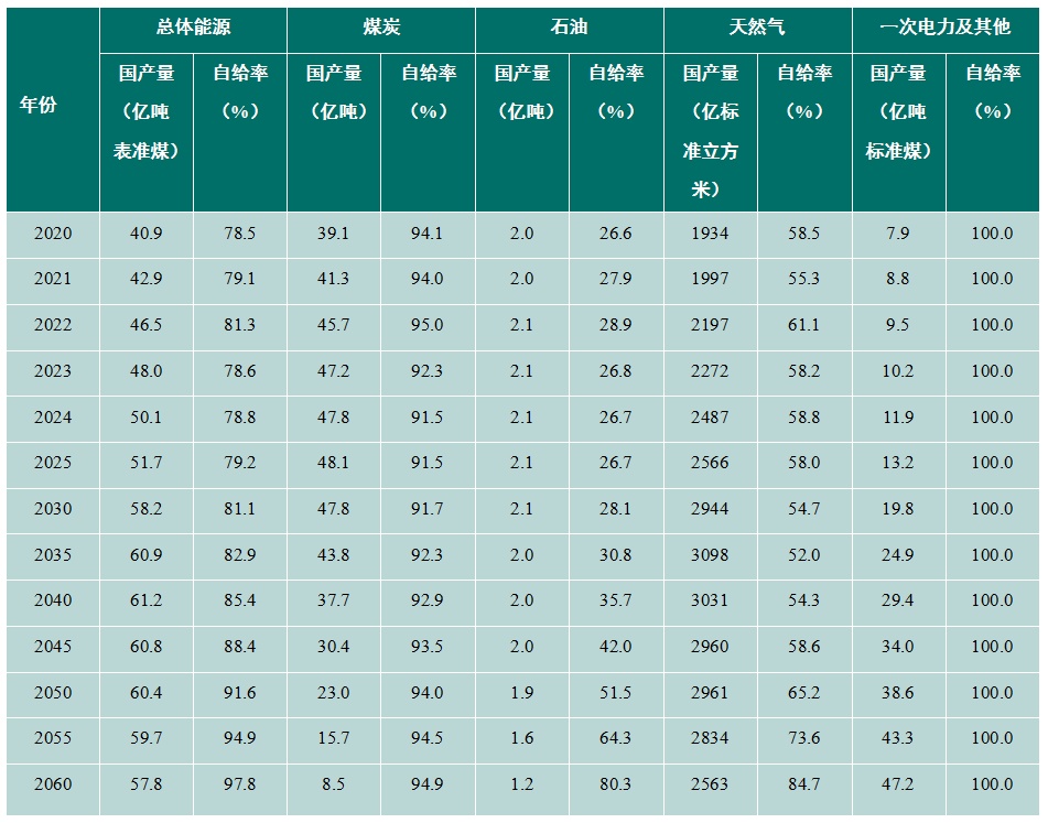 煤炭在助力非化石能源大规模高质量发展过程中将发挥重要的兜底保障作用,煤炭产量将在“十五五”期间达到峰值(48亿~49.5亿吨)后保持较长时间平台期,2035年前保持在43亿吨以上高位水平以兜住能源安全底线,到2045年降至30亿~31亿吨,2060年降至8亿~9亿吨。我国煤炭自给率始终保持在90%以上的高位水平,且不断提升,预计到2060年达到95%左右。
