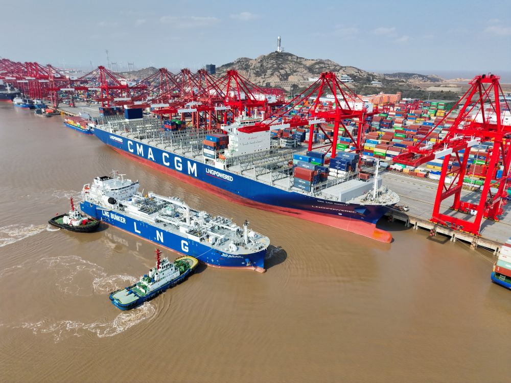 记者从洋山港海事局获悉,2月22日上午,两艘液化天然气(LNG)燃料加注船首次同时为国际航行的大型集装箱船完成燃料补给。继去年进入“双船加注阶段”后,洋山港首次实现双船并行作业,单日加注能力翻倍。