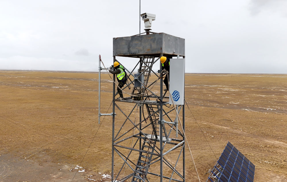 4月25日,中国移动通信集团青海有限公司工作人员在可可西里库赛湖附近安装5G基站设备。(受访单位供图)