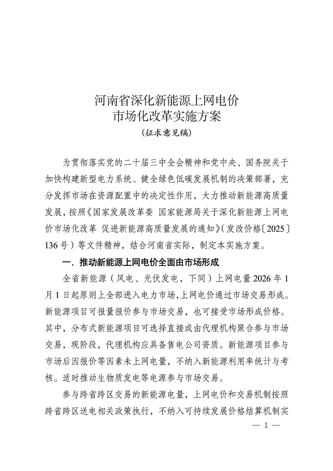 10月11日,河南省发改委发布关于公开征求《河南省深化新能源上网电价市场化改革实施方案(征求意见稿)》意见的公告。